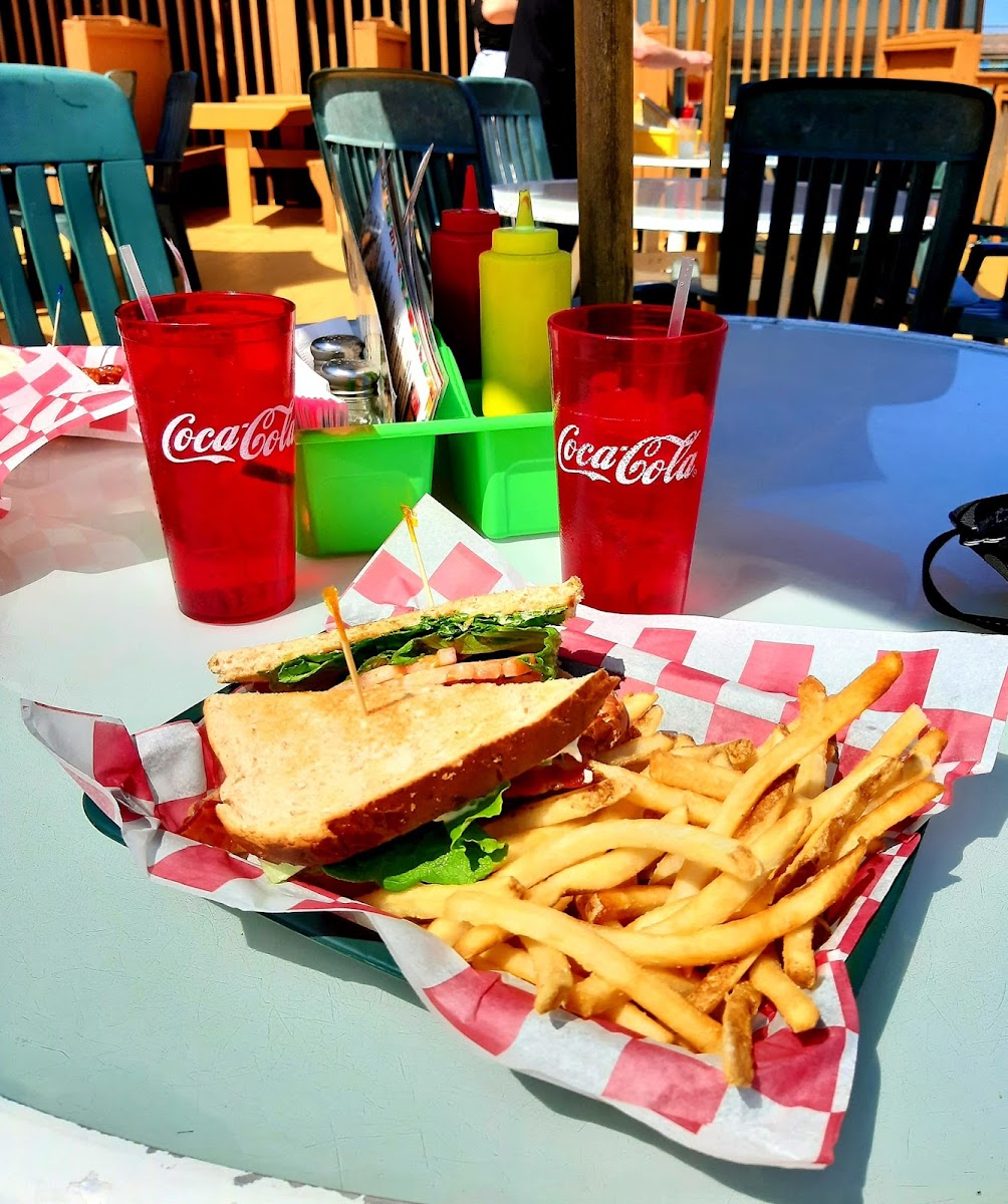 Nice deck with an awesome view. I've always had good food here. They do a great BLT, with everything properly cooked. The cheese curds and fries are tasty, and they have a good veggie burger that they know how to cook properly. I am not into wings, but my friend always gets the wings and likes them. Great drink specials and fun selection of summer drinks. The service on the deck can be slow and inattentive at times, and you might have to flag someone down. Usually it's because there is not enough staff or one person is doing multiple jobs.